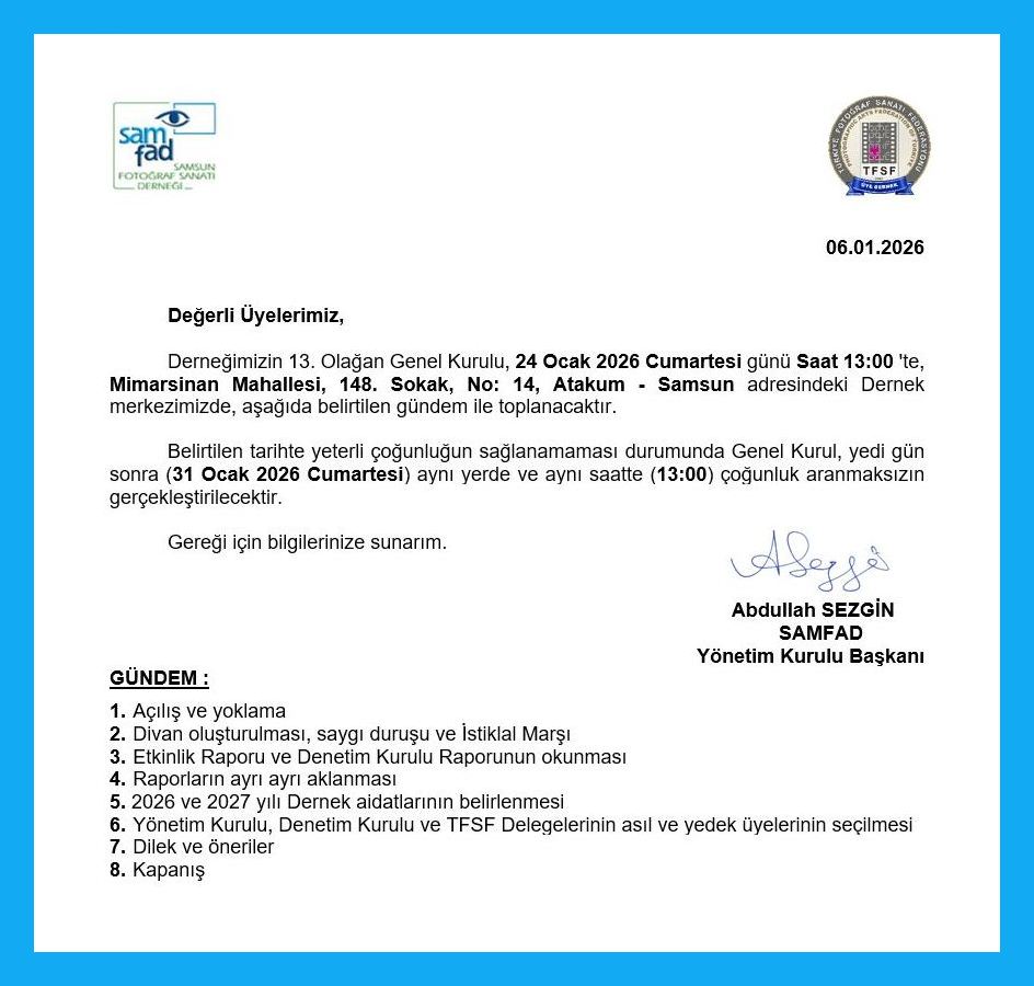 Web sitemize hoşgeldiniz. Samsun ili içerisinde fotoğraf sanatı tutkunlarının bir araya geldiği, Türkiye Fotoğraf Sanatı Federasyonu üyesi derneğimiz resmi web sitesinde hoşça vakit geçirmenizi dileriz.